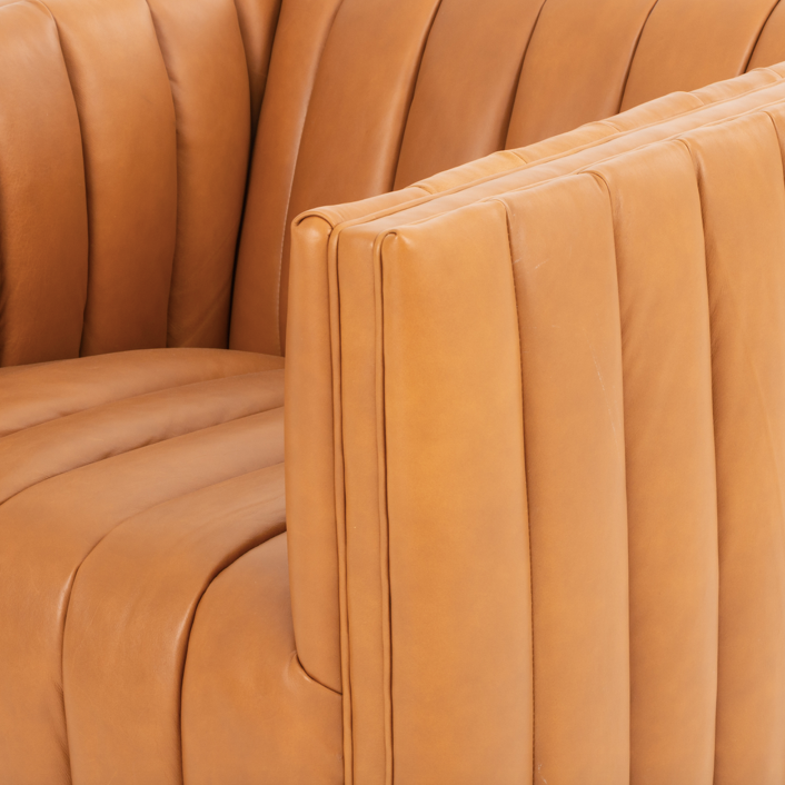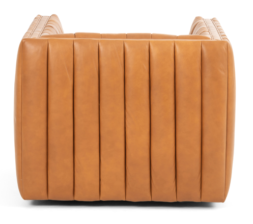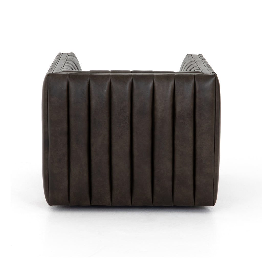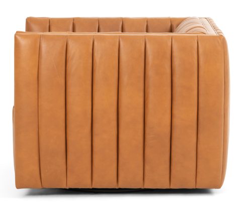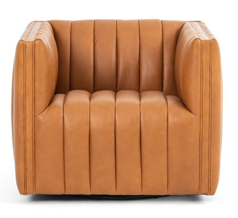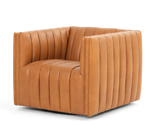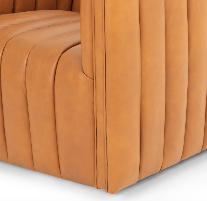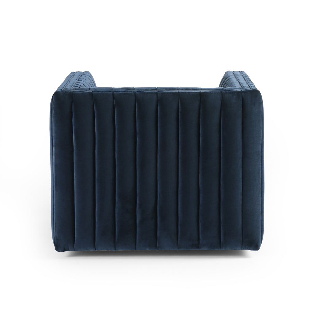 A modern take on classic library chair, luxurious poly-blend navy seating takes on dramatic channeling for trend-forward texture and sumptuous sit. Swivel feature amps up fresh appeal from every angle.